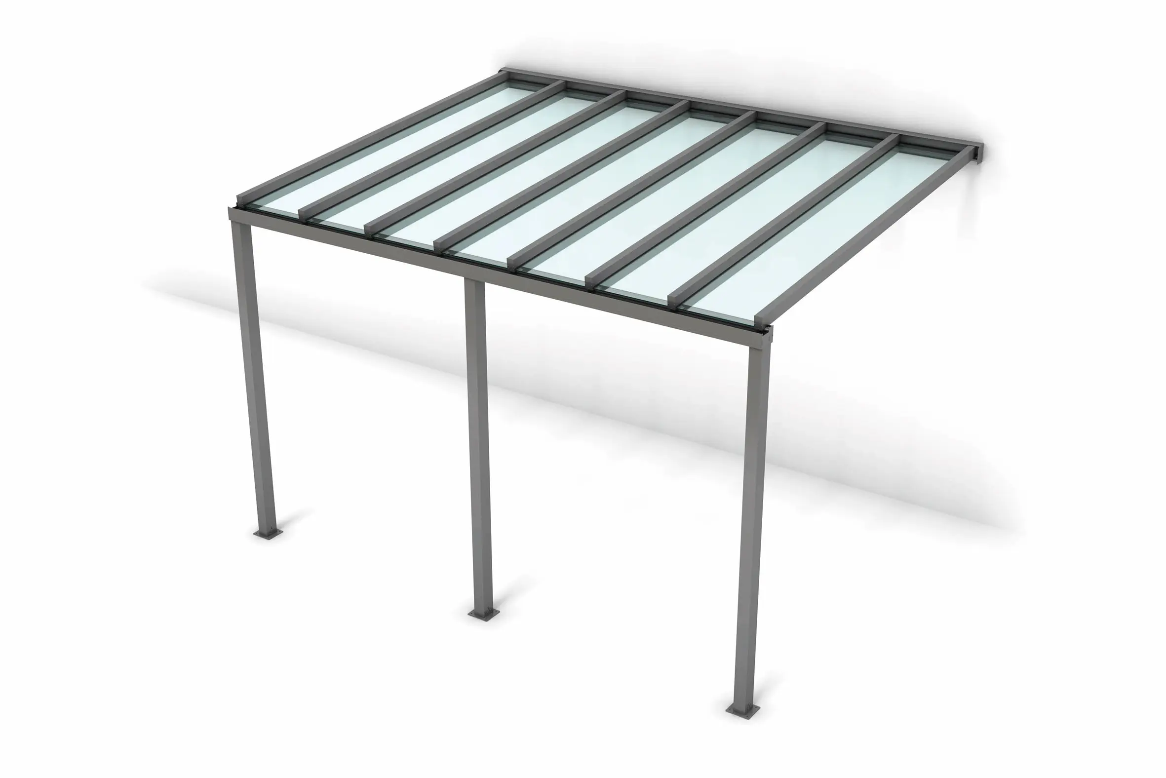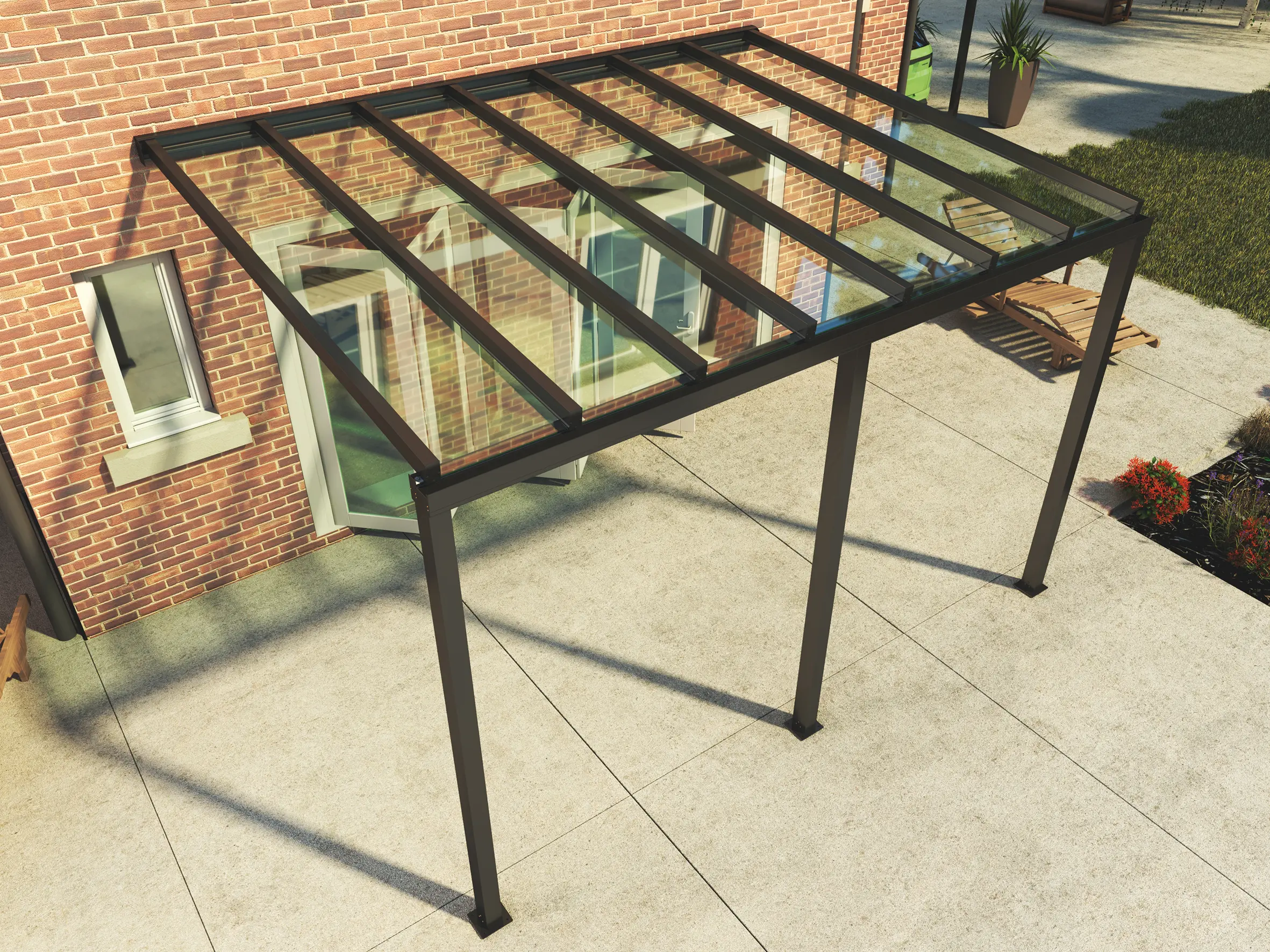 The system accommodates 6.4mm laminated glass or 6mm polycarbonate, allowing flexibility in design, light transmission, and budget. Integrated guttering ensures effective water management while maintaining a sleek, uninterrupted aesthetic.