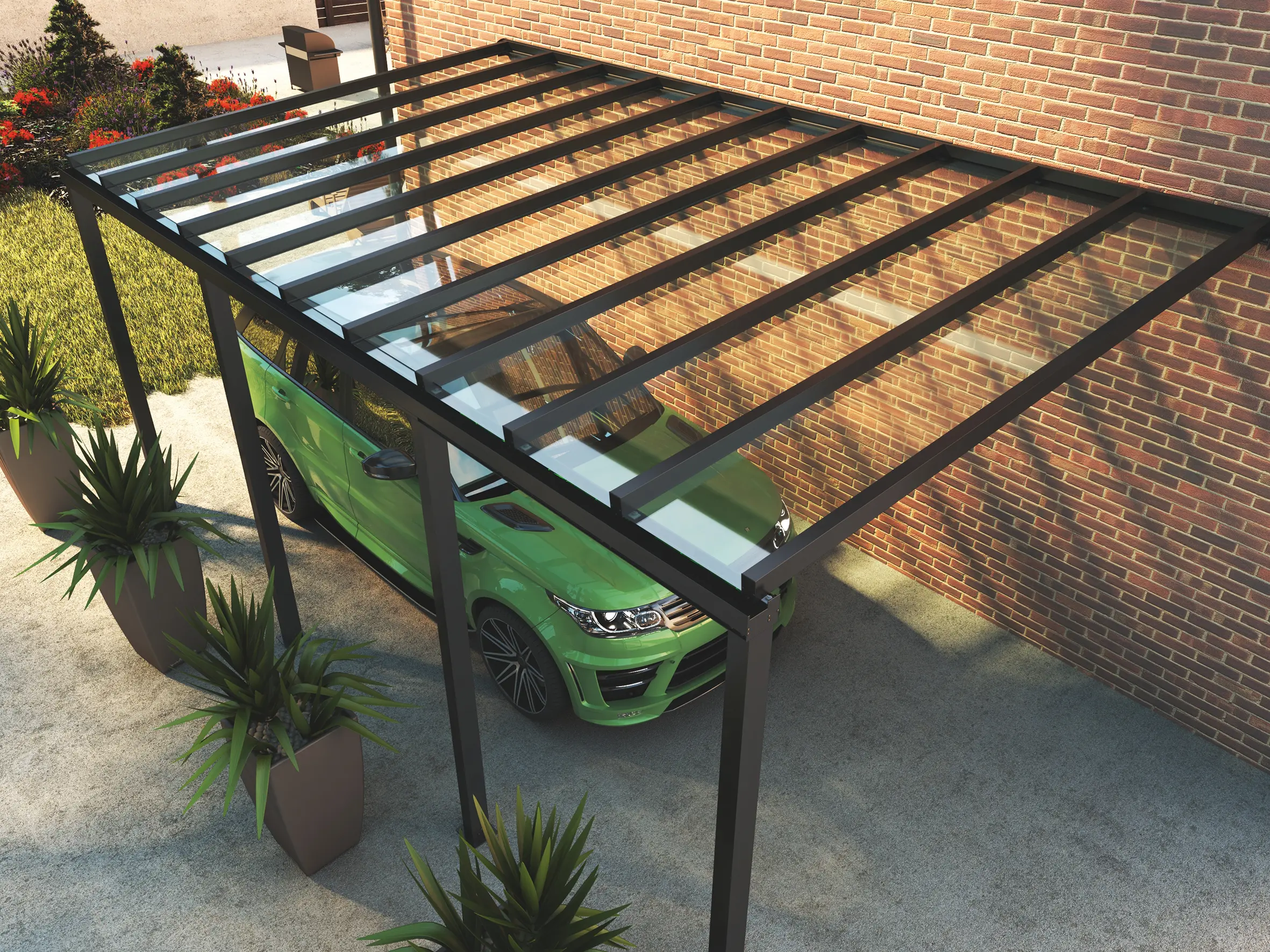 The Guardian Veranda can be configured as a stylish carport, offering protection for vehicles from rain, frost, and sun while maintaining a clean, modern aesthetic